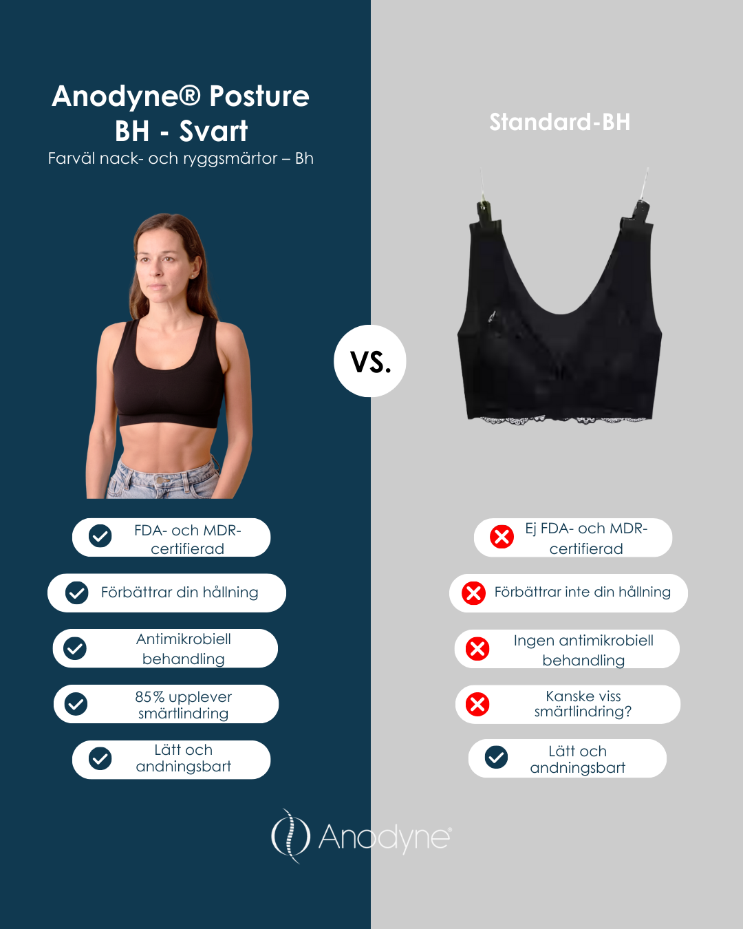 En klassisk behå erbjuder ofta endast grundläggande stöd och kan vara obekväm, begränsande eller orsaka tryck i vardagen. Anodyne® Posture Bra har särskilt utvecklats för att inte bara ge pålitligt stöd utan också aktivt främja en bättre hållning. Tack vare dess integrerade och riktade stödteknologi aktiveras musklerna varsamt och överkroppen rätas naturligt upp — utan att strama eller begränsa rörelsefriheten. Därmed kombinerar Anodyne® Posture Bra hög komfort med märkbart stöd och stabilitet i vardagen.